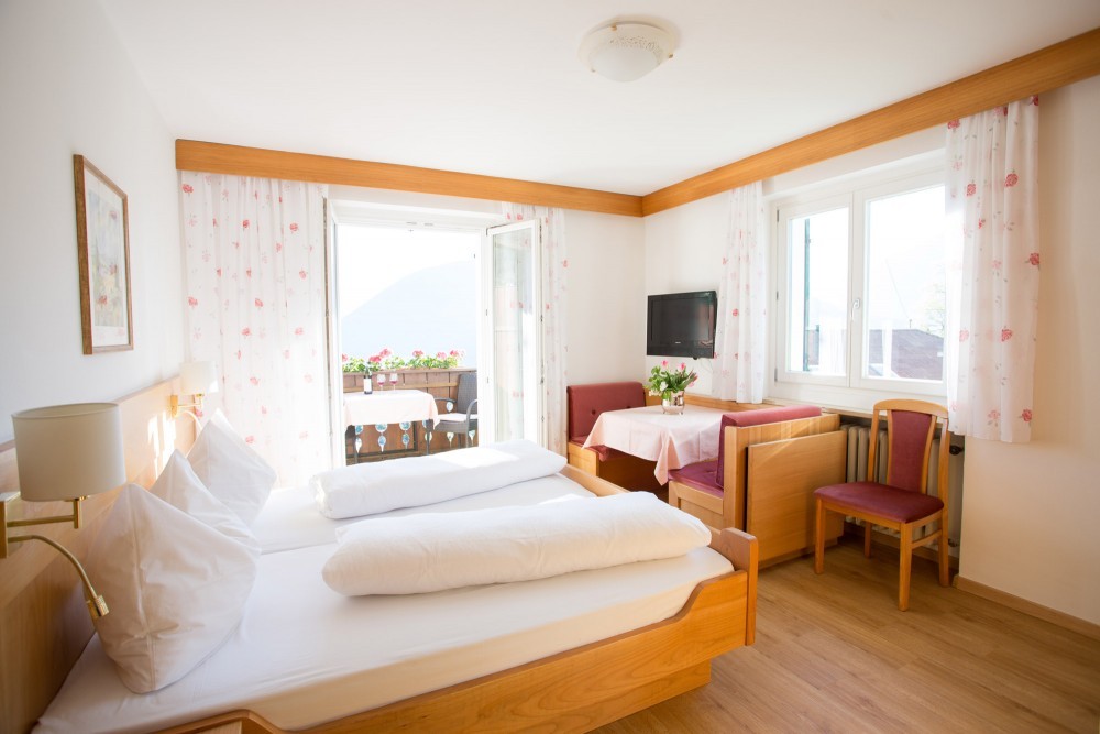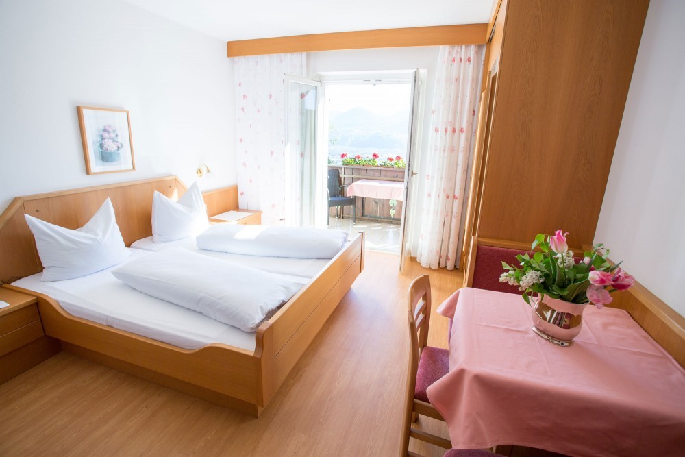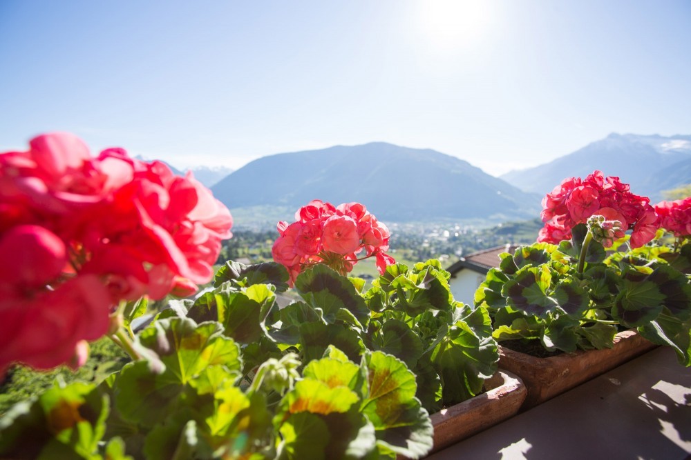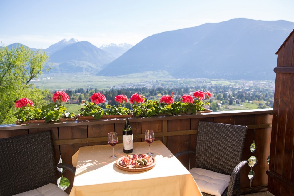 Ca. 20 m2 Südseite, Balkon mit Panoramablick auf Meran und Umgebung, Kühlschrank, Dusche, WC, Föhn, Sitzecke, SAT-TV, WLAN und Safe. Ein Kinderbett ist nicht vorhanden.