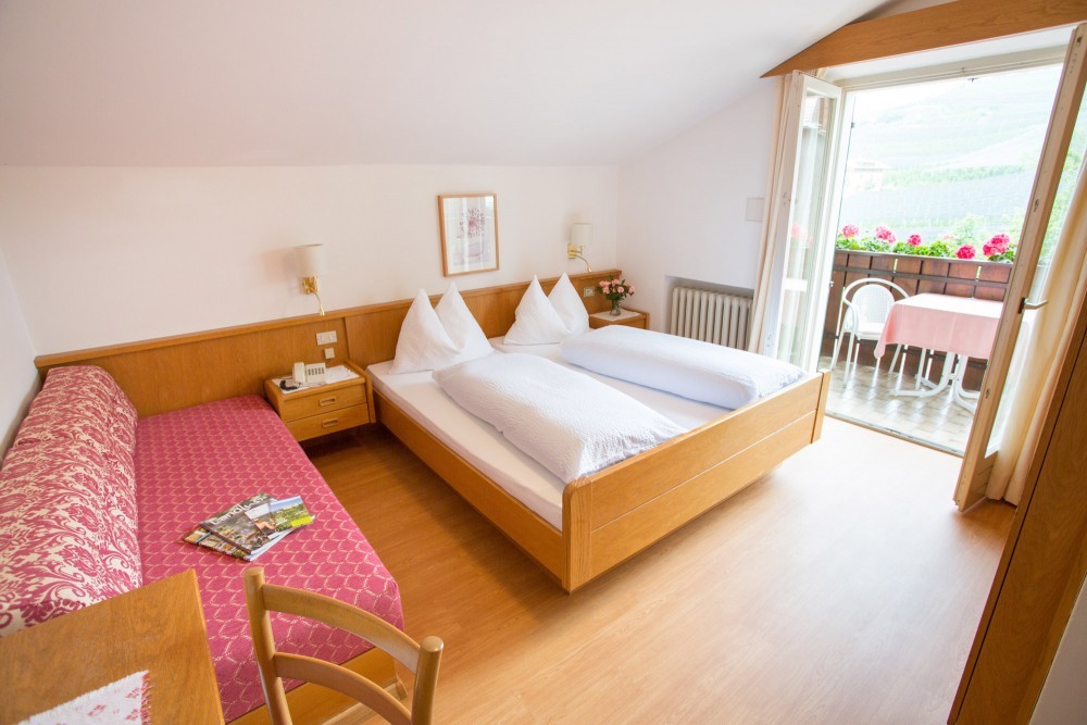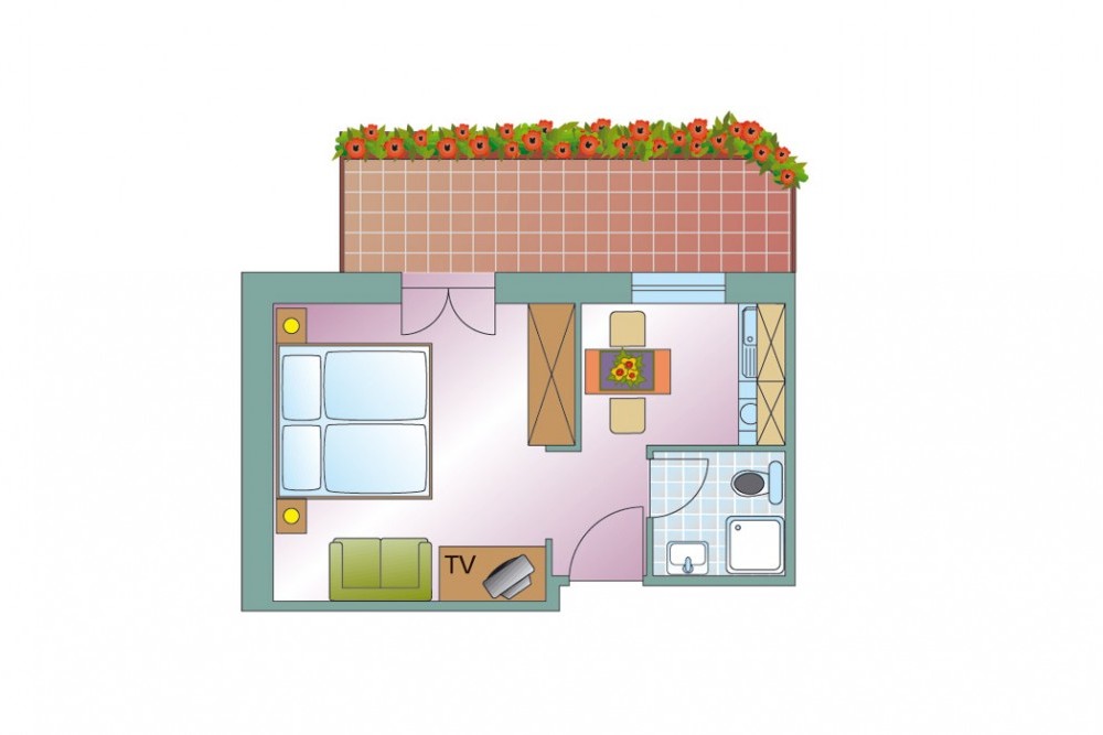Appartemento con vista giardino per 2 persone; 30 m2; 2° piano, esposizione ad est, dispone di una camera doppia con divano, ampio balcone con vista panoramica su Scena e dintorni, cucina-soggiorno, macchina per il caffè, bollitore, bagno con doccia, SAT-TV, WIFI, cassaforte e biancheria completa (cambio settimanale), servizio pane fresco. Non è disponibile una culla.